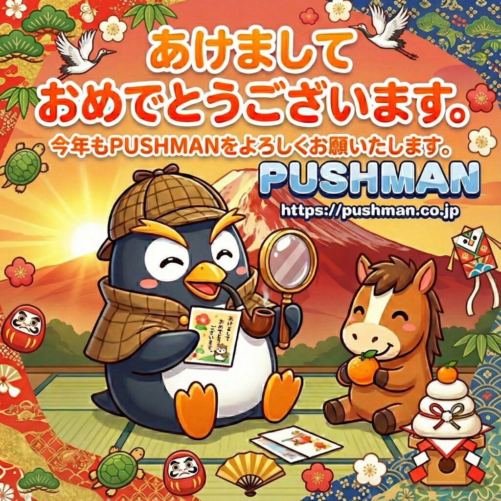 旧年中はPUSHMANをご利用いただき、誠にありがとうございました。 2026年は「午(うま)年」です。私たちも馬のように軽やかに、そして力強く駆け抜け、皆様のお役に立てるよう邁進してまいります。